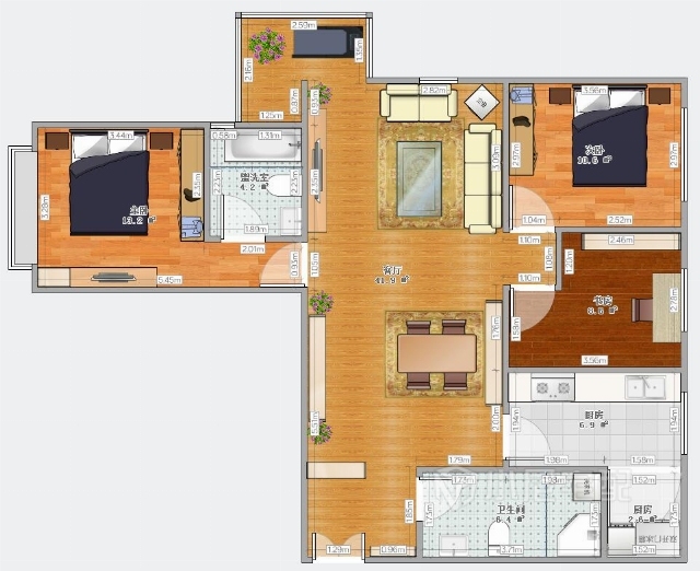 書房:采用木色書柜書桌,空間布局突出整體性,色調(diào)溫暖,給人簡(jiǎn)潔、明亮的通透感