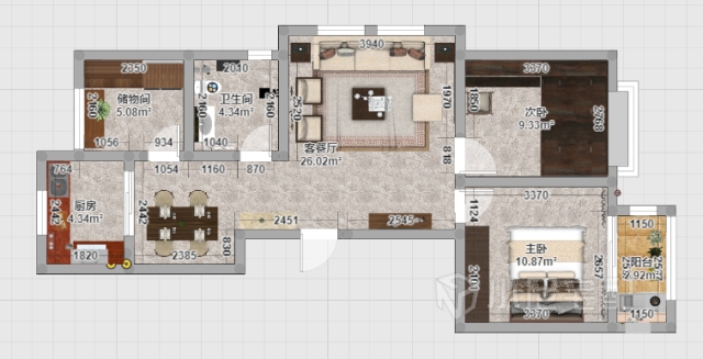 儲物間在廚房旁邊,因?yàn)閺N房餐廳空間有限,冰箱安排在此,高柜用來放衣服矮柜用來放一些廚房用品,給主人留足儲物的地方。