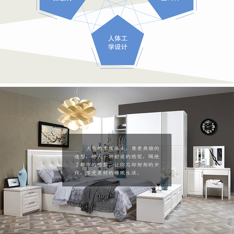 | 規(guī)格 | 外掛門衣柜:2000×605×2250mm、床頭柜:552×400×477mm、軟床:2103×1910×360mm、床墊:1800×2000×260mm、臥房電視柜:1880×450×415mm、妝臺:1100×400×760mm、妝凳:400×300×420mm |