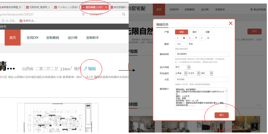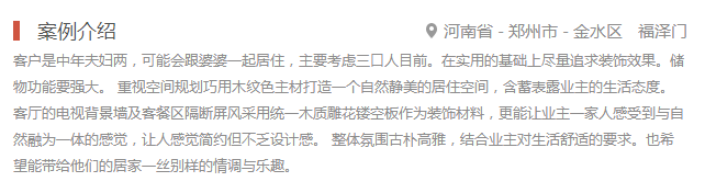 3、案例簡介需包含:項(xiàng)目名稱、地址、家裝家具一體價(jià) (價(jià)格標(biāo)準(zhǔn):阿拉伯?dāng)?shù)字加萬元) 、案例簡介。例如下: