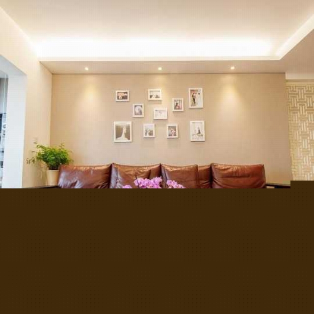 沙發(fā)背景墻作為了展示小夫妻婚紗照的照片墻。深色的皮沙發(fā)增加了整個空間色調的重量。