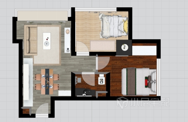 整個(gè)空間的布局,集客廳、餐廳、廚房一體化,合理利用空間。