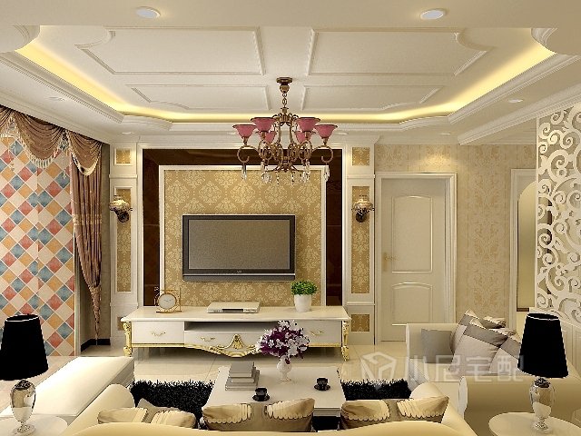 大氣的吊頂,精致多層電視墻充滿奢華,暖黃色沙發(fā)和壁紙不失溫馨。