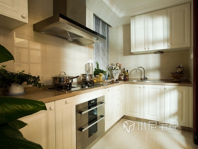 櫥柜設(shè)計有抽屜柜、拉籃柜、消毒柜及開門柜既滿足廚房操作所需又使有限的廚房空間非常整齊。