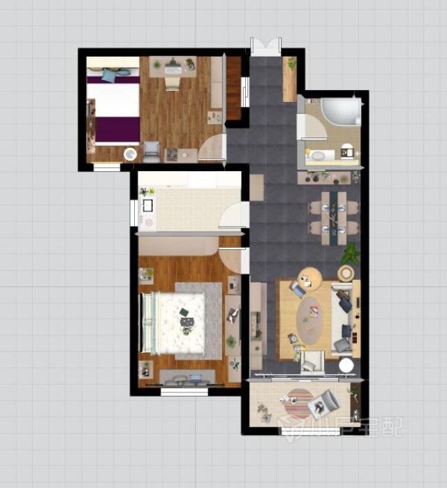 深灰色的地磚搭配暖黃色的地毯,顯得十分溫馨。定制的電視柜組合增加了儲物功能。