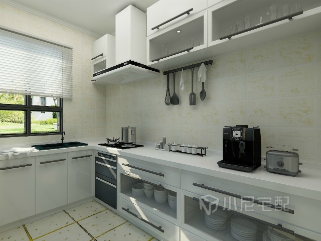 廚房全用白的櫥柜組合,視覺(jué)上顯得寬闊敞亮, 功能齊全。