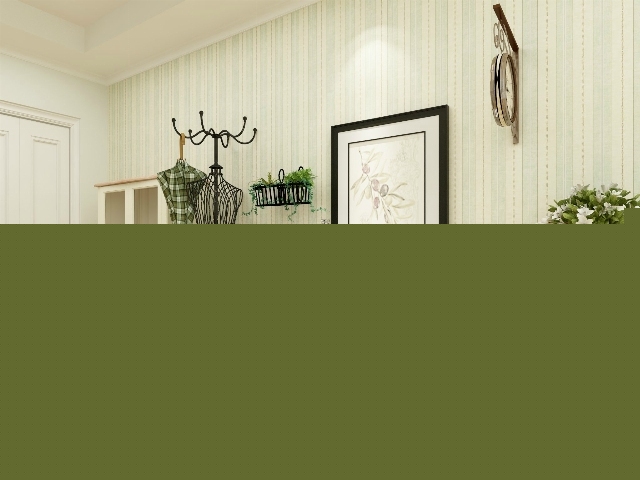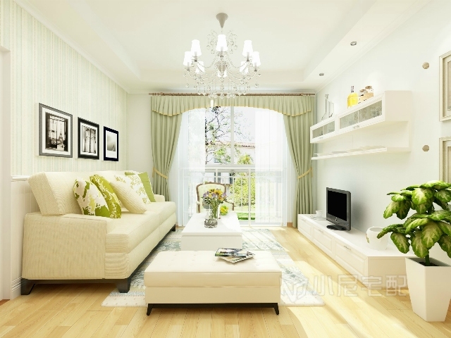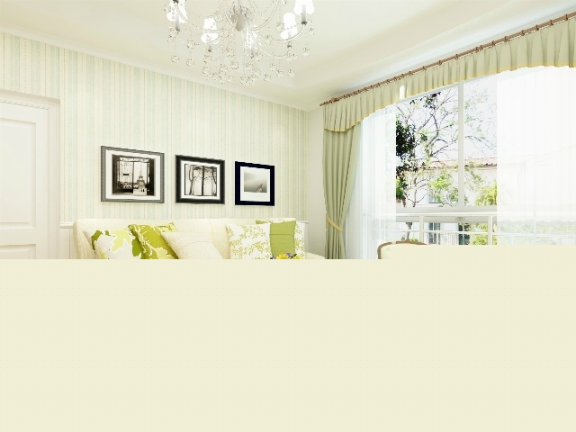 白色的護(hù)墻板,白色的布藝沙發(fā),綠色條紋壁紙,綠色花紋的抱枕與窗簾,做到色彩上的呼應(yīng)。
