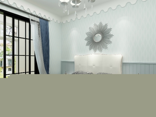 次臥選用淡綠色壁紙,顯得空間開闊,晶瑩的珠簾使房間更加通透。