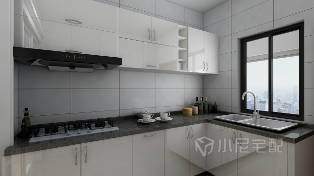 整個(gè)空間門板柜體采用的是亮白色的門板搭配黑色石英石,使得整個(gè)廚房干凈又明亮