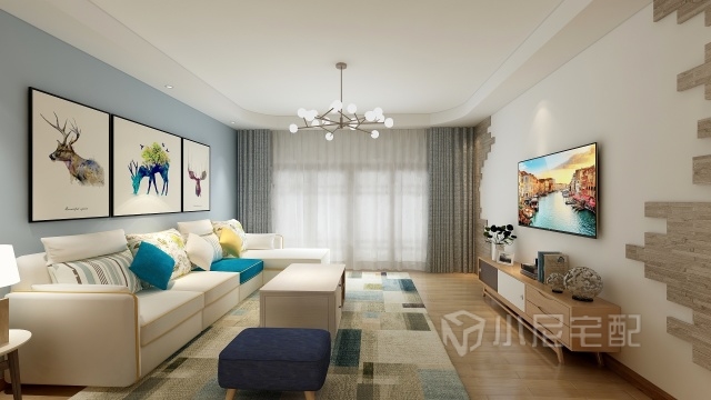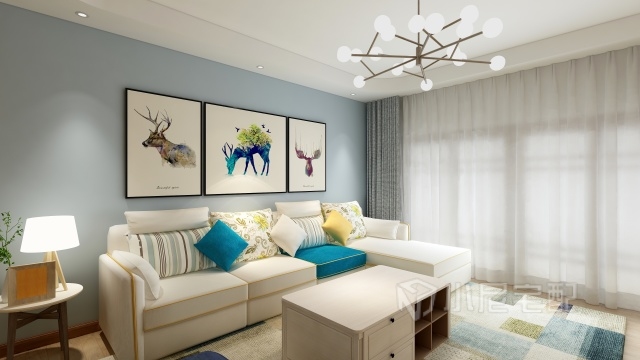 用小尼沙發(fā)色彩飽滿度較高的靠墊抱枕搭配以干凈明亮的茶幾以及淺孔雀藍(lán)的沙發(fā)背景墻,令整個(gè)客廳空間鮮亮。
