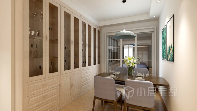 餐廳酒柜的設(shè)計(jì)是金絲胡桃的柜體 跟整個(gè)空間的顏色相協(xié)調(diào),餐廳掛畫的位置是點(diǎn)睛之筆