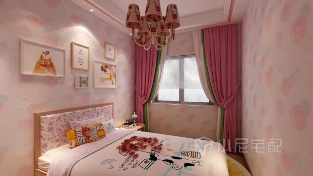 粉色公主房的設(shè)計(jì)采用的是丹麥暖陽系列,金絲胡桃的床頭使整個(gè)空間溫馨恬靜