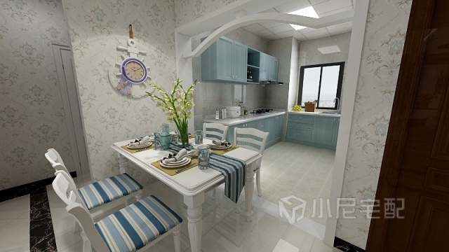 餐廳整體以地中海風格 開放式廚房寬敞可提供多人在廚房準備食物