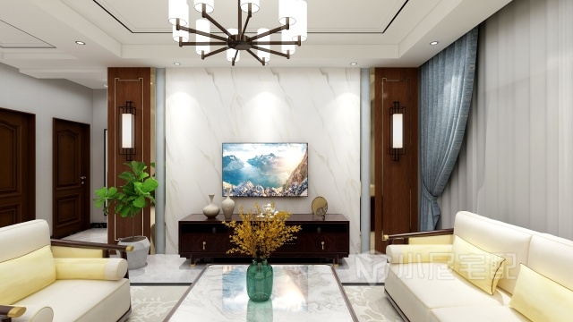 濃郁的高雅感營造出精致的空間,明暗色調(diào)和諧共處,其中點綴的少許亮色是點睛之筆。環(huán)顧四周之時,軟裝的搭配相得益彰,電視背景墻大理石的輝煌感更使整個空間大放異彩,是吸睛之處。