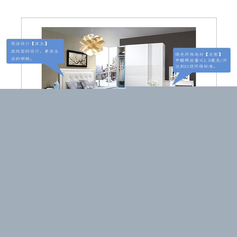 | 規(guī)格 | 外掛門(mén)衣柜:2000×605×2250mm、床頭柜:552×400×477mm、軟床:2103×1910×360mm、床墊:1800×2000×260mm、臥房電視柜:1880×450×415mm、妝臺(tái):1100×400×760mm、妝凳:400×300×420mm |